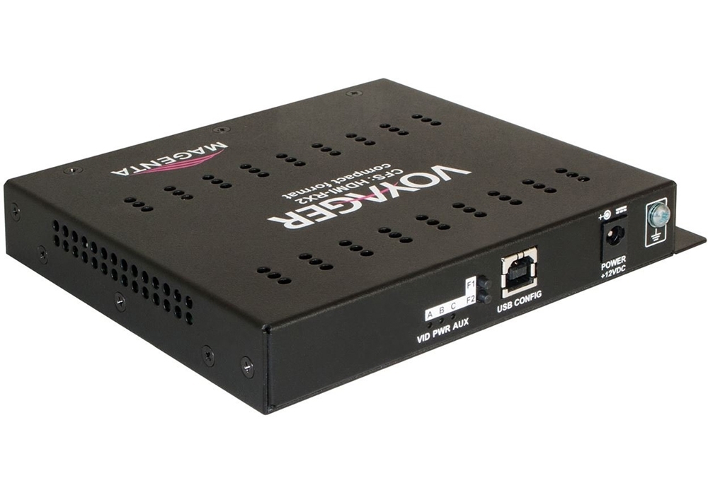 HDMI / DVI receiver for signals up to 1920×1200/60 with HDCP 1.1, audio (2.5 mm microJack), and RS-232 from a fiber optic line (2×LC). Includes an SFP module for multimode fiber optic patch cord, range 2000 m.