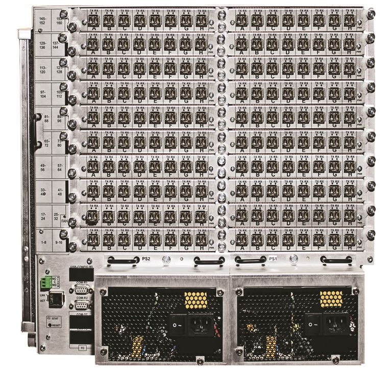 Universal chassis for modular matrix switcher (20 slots – 8 duplex inputs/outputs per slot); possible matrix switcher configurations – 80×80, 1×159, 159×1, etc.