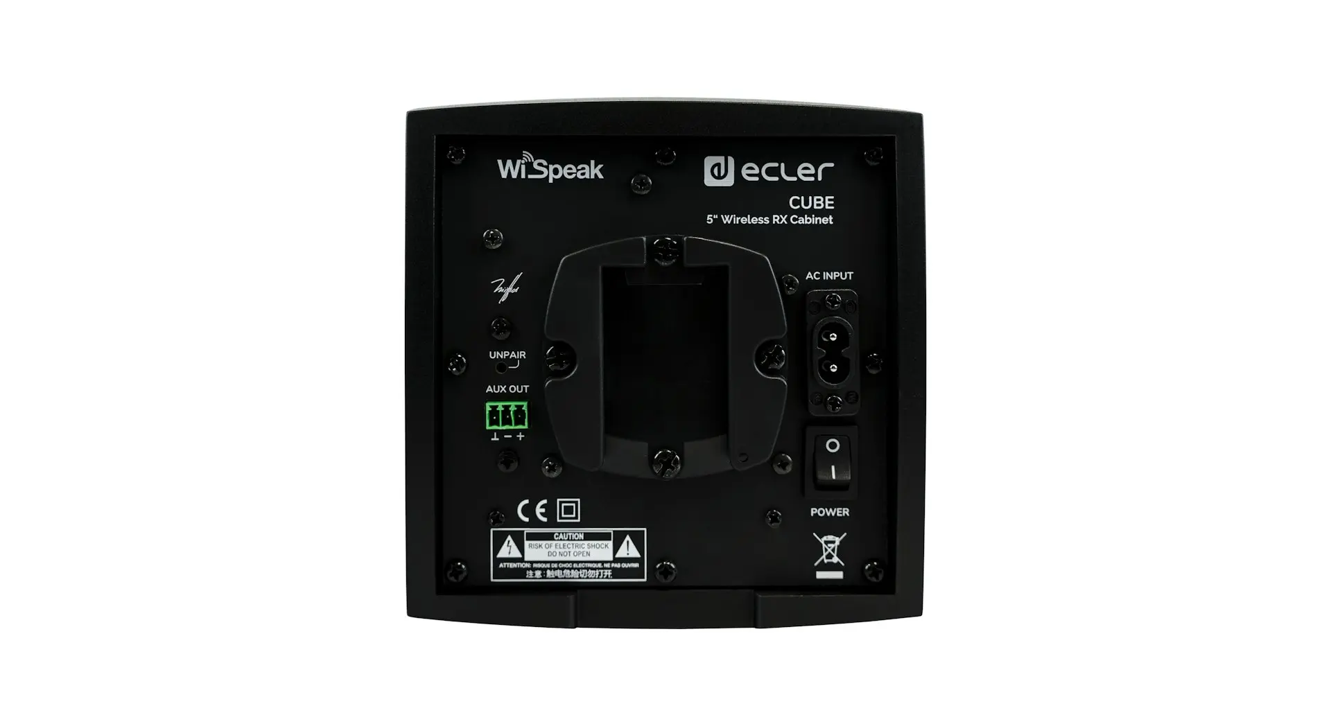 Ecler WiSpeak system receiver (range 12 m), wireless pendant loudspeaker 5”, 32 W – 8 Ω for use with Global Track Pro. Wall mounting (bracket and power cable included). AUX output (3-pin Phoenix). 70 Hz – 20 kHz (−10 dB). Sensitivity 83 dB. Color black.