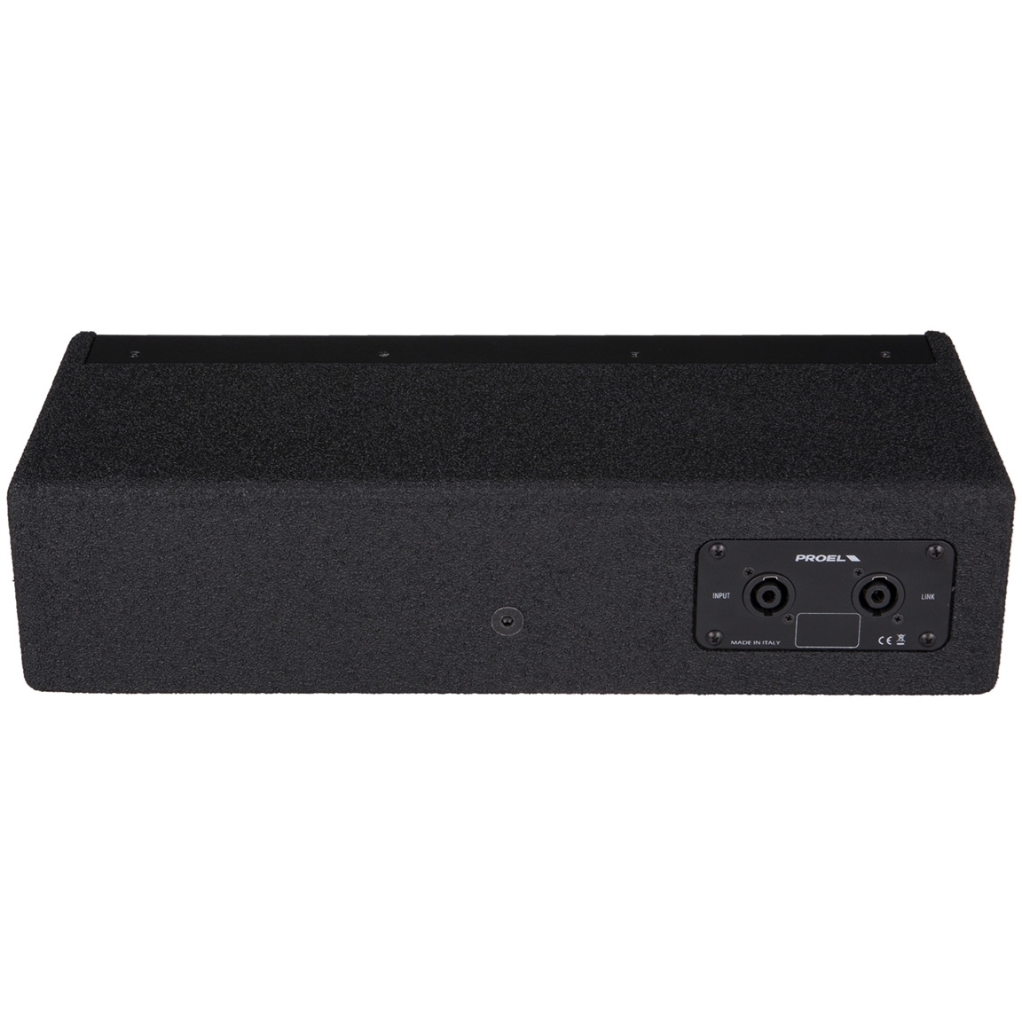 The Axiom ED25P passive loudspeaker in black is a two-way system with two 5.25-inch woofers and a 1-inch dome tweeter. Nominal power is 100 W RMS, program power is 200 W, sensitivity is 93 dB, maximum sound pressure level is 116 dB. Frequency range is 125 Hz – 20 kHz (−6 dB) with an asymmetrical dispersion pattern of 80×65°. The enclosure is made of 15 mm birch plywood with a moisture-resistant finish. It can be installed as a stage monitor with a 20° tilt, and features mounting holes for M8 and M5 screws. It is equipped with 4-pin SpeakON connectors for input and through signal.