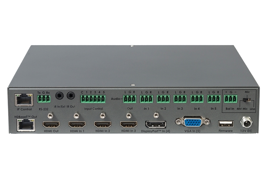 Multiformat processor and auto-switcher for VGA, 3×HDMI, DisplayPort 1.1, and audio (5× Phoenix 3-pin + Mic/Line) signals into HDBaseT signals with PoH and HDMI 4096×2160/60 (4:4:4) with HDCP 1.4, 2.2, EDID, and CEC, audio (Phoenix), control via IR, RS-232, and dry contacts. Range: 1080p – 70 m, 4K – 40 m. Compatible receiver: EXT-UHDA-HBTL-RX.