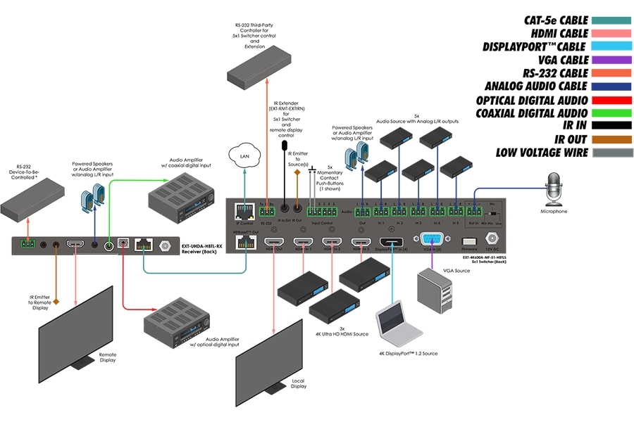 Multiformat processor and auto-switcher for VGA, 3×HDMI, DisplayPort 1.1, and audio (5× Phoenix 3-pin + Mic/Line) signals into HDBaseT signals with PoH and HDMI 4096×2160/60 (4:4:4) with HDCP 1.4, 2.2, EDID, and CEC, audio (Phoenix), control via IR, RS-232, and dry contacts. Range: 1080p – 70 m, 4K – 40 m. Compatible receiver: EXT-UHDA-HBTL-RX.