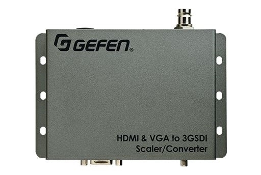 Gefen EXT-HDVGA-3G-SC – HDMI, VGA, and stereo audio signal scaler and switcher with conversion to SD/HD/3G-SDI format. Supports input resolutions up to 1920×1200 for VGA and 1080p60 for HDMI, and the output signal is generated at up to 1080p60 with support for 3G-SDI level A and B formats. The device is equipped with a convenient OSD menu for quick parameter adjustment, supports scaling with the ability to change aspect ratio, includes a test signal generator and an analog stereo audio embedder for VGA. Control is implemented using the special Gefen Syner-G software via USB, supports a power range of 6–24 V and is equipped with fixed power and HDMI connectors. The compact housing can be installed on a flat surface.