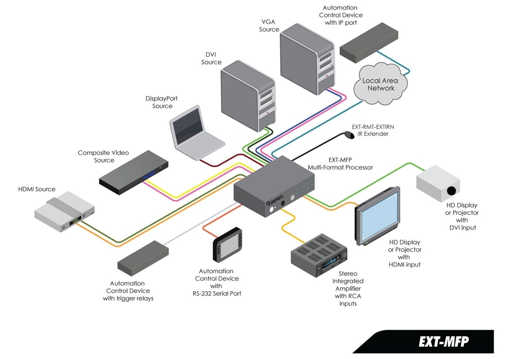 Gefen EXT-MFP Multi-Format Signal Processor converts and scales video signals of various formats: composite video (CV), VGA, DVI-D, HDMI, and DisplayPort, along with analog and digital audio, into DVI-D and HDMI output signals with support for analog stereo and S/PDIF digital audio. Maximum input and output resolution reaches 1080p60 and 1920×1200 (WUXGA). The device supports HDCP, EDID, independent video and audio switching, and implements password protection and access rights management. Control is possible via IR, RS-232, Ethernet (web interface, Telnet, UDP) and is supported by Gefen Syner-G software. The chassis is designed for desktop installation or mounting in a 19” rack with an optional adapter.