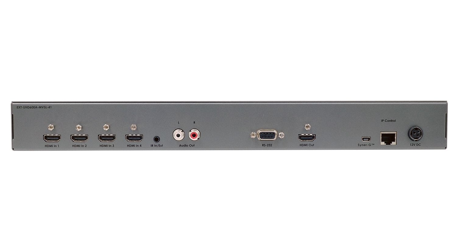 The seamless switcher/multiviewer Gefen EXT-UHD600 A-MVSL-41 supports 4 HDMI inputs with resolutions up to 1080p/60 and HDCP 1.4, converting the signal to a 4K/60 HDMI output (YUV 4:4:4). The device provides arbitrary scaling and allows placing each source’s image in a window of any size and position on the screen. It features independent switching of embedded audio signals with analog stereo audio output. Control is possible via the front panel, using an IR remote, RS-232, and IP (web interface, Telnet, UDP). It is supplied with an IR remote, IR receiver, cables, and a rack-mount kit. The housing is 1U high for rack mounting.