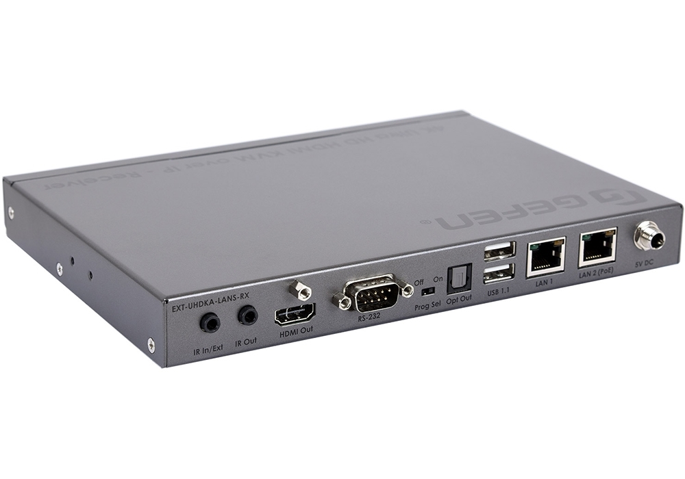 Gefen EXT-UHDKA-LANS-RX Receiver receives HDMI 4K/60 (4:2:0), USB (4 Type A ports — 2 USB 1.1 and 2 USB 2.0), RS-232, stereo audio, and infrared (IR) control signals over IP Ethernet networks (1000BaseT) via Cat.5e/6 twisted pair cable at distances up to 100 meters. Supports HDCP 1.4 and 2.2, HDR, Deep Color, and transmission of multichannel audio up to 7.1 with high bitrate (including Dolby Atmos, DTS:X). Features a built-in Gigabit Ethernet switch, control is possible via web interface, Telnet, UDP. Suitable for building video walls up to 16×16 and complex AV/IT systems.