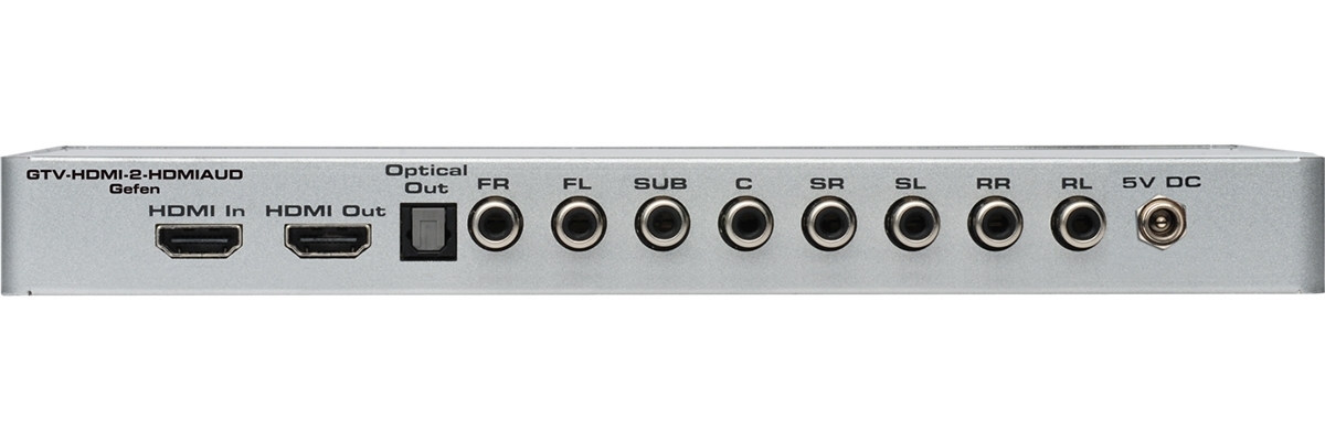 Audio signal decoder Gefen GTV-HDMI-2-HDMIAUD is designed to extract the audio signal embedded in the HDMI 1.3 stream, with output to separate digital outputs for connecting external speaker systems. It supports video signals with resolutions up to 1920×1200 and high-definition formats up to 1080p. The device is compatible with HDMI 1.3, DVI 1.0, and HDCP 1.1, supports multichannel 7.1 audio, Dolby TrueHD, DTS HD Master Audio, as well as Lip-Sync synchronization and CEC control signal transmission. The built-in EDID emulator allows selecting the audio format, and switches on the housing provide convenient control over operating modes. Outputs include HDMI, an optical TOSLINK interface, and 8 RCA connectors for multichannel analog audio. Power is supplied via 5 V with a threaded locking connector for secure power adapter connection. The metal housing is used for mounting the device.