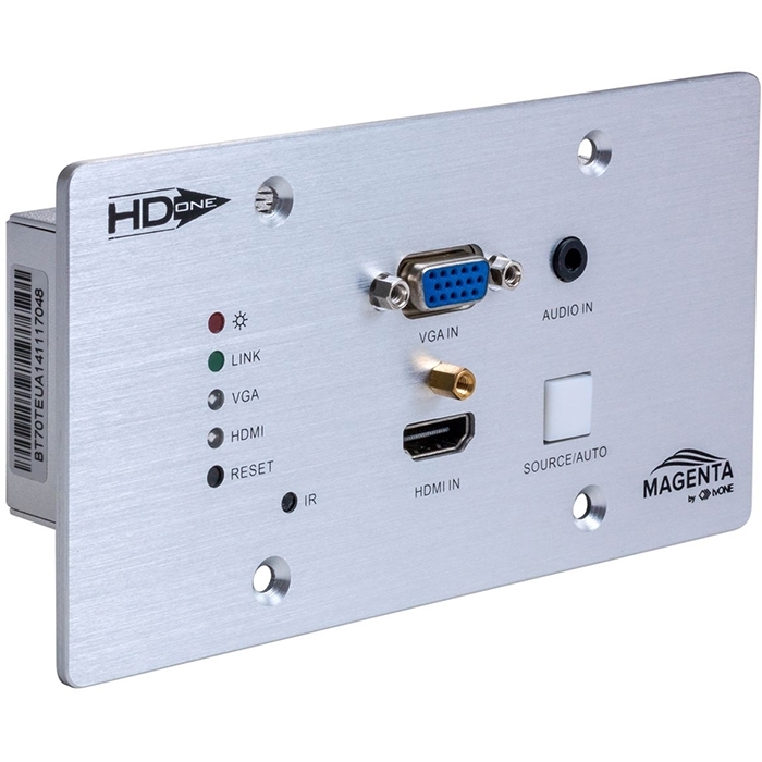 Wall-mounted transmitter/scaler/switcher with automatic signal switching for HDMI 1.4 4Kx2K/60, VGA 1920×1080/60 with audio (miniJack 3.5 mm), IR and RS-232 over CAT5e twisted pair with PoH from the receiver, HDBaseT (compatible for use with CORIO CM-HDBT modules), transmission distance up to 70 m. Compatible receiver: MG-CT-612. European version.