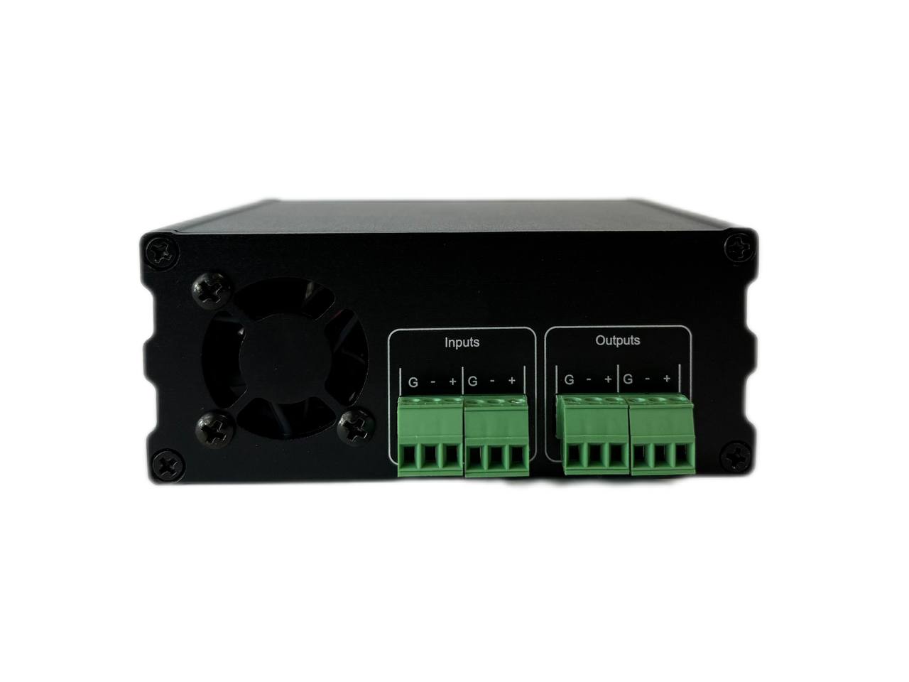 Dual-channel analog audio and Dante interface signal transcoder (2x Phoenix input/output), powered by 48 V PoE or external power supply.
