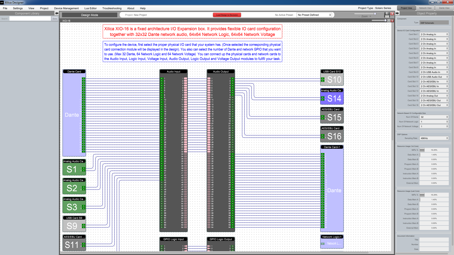 XILICA SOLARO XIO 16 is a multi-channel Dante interface converter built on the 16-slot XILICA SOLARO family chassis. The model provides 32×32 channels for the Dante audio network and is equipped with sixteen slots for installing input/output modules. In addition to analog and digital audio modules, the chassis allows for the installation and configuration of GPIO and relay modules, thereby enabling the transmission of not only audio data but also control signals over IP networks. Control is performed via the Xilica Designer software; signal processing is not available for XIO models, however, input and output modules can be configured according to their functionality, for example, phantom power control, sensitivity level adjustment, etc. are available.