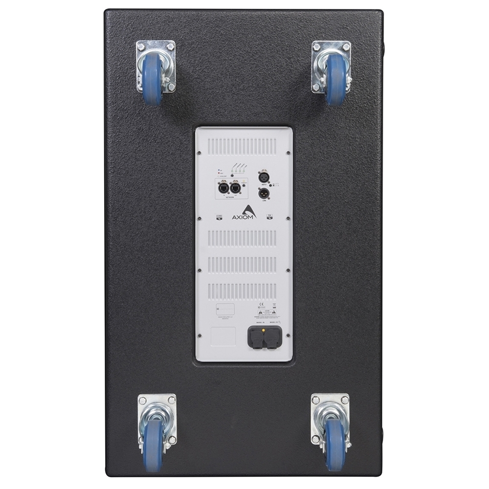 Active subwoofer Axiom SW1800 A in black color is equipped with two 18-inch low-frequency drivers featuring a moisture-resistant reinforced fiberglass cone and 4-inch voice coils. A Class D amplifier with a total power of 2000 W (2×1000 W) and a DSP processor with a 40-bit SHARC architecture provide clean and powerful sound in the frequency range of 36–150 Hz (±3 dB). The maximum sound pressure level reaches 139 dB. The cabinet made of 15 mm birch plywood with a moisture-resistant coating is equipped with sturdy handles and wheels for easy transportation.