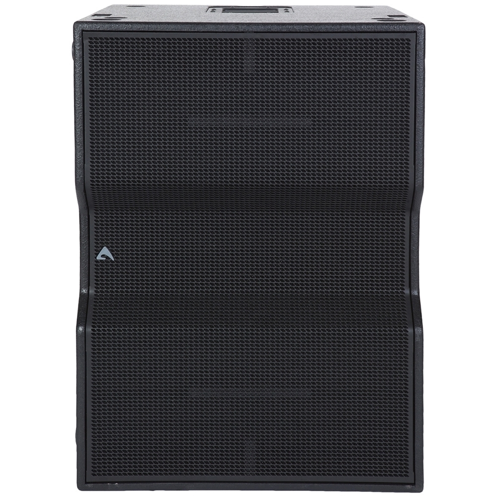 Passive subwoofer for line array Axiom SW215FP in black color, equipped with two 15-inch drivers with a nominal power of 2×700 W RMS and a peak power of up to 2×2100 W. Designed for professional sound reinforcement, delivering deep, rich bass with a frequency range from 40 to 150 Hz. The enclosure is made of birch plywood with a moisture-resistant coating and is fitted with wheels for easy transport.